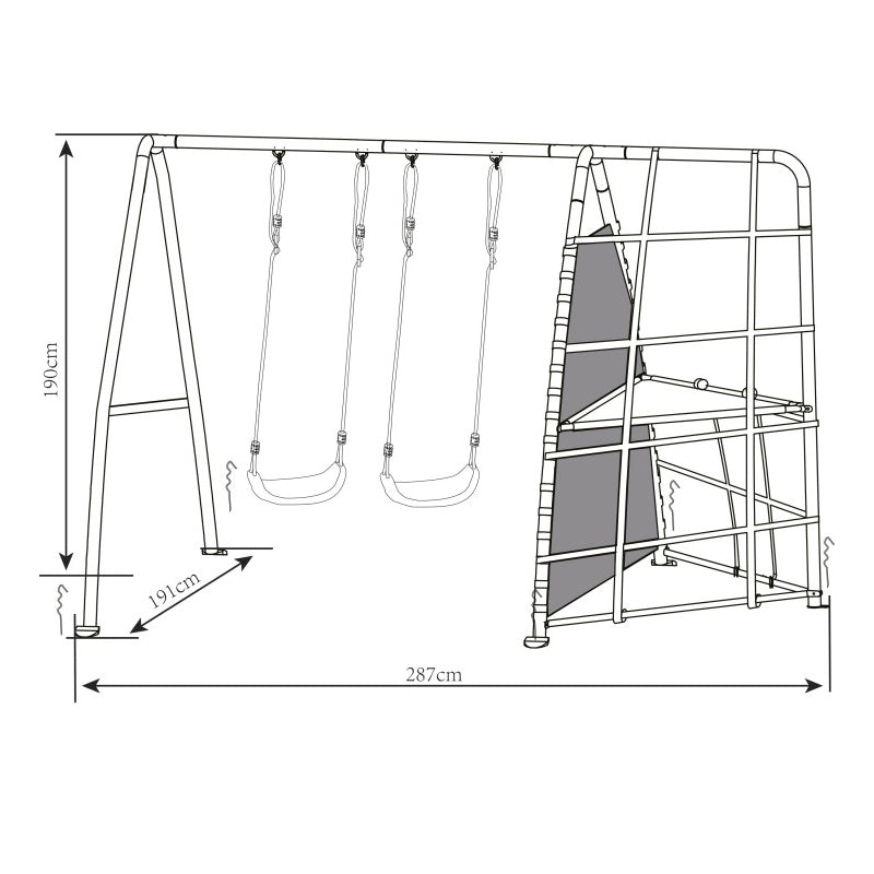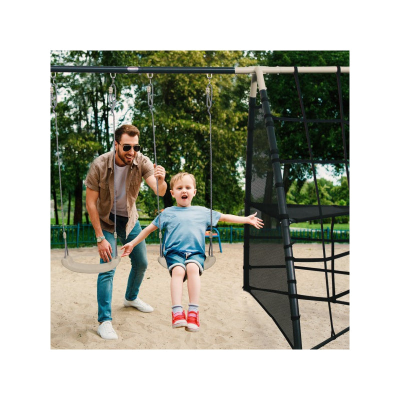 Laat je kinderen onvergetelijke momenten beleven in de buitenlucht met de dubbele schommel van AXI! Deze veelzijdige set combineert twee klassieke schommels met een uitdagend klimnet, waardoor kinderen vanaf 3 jaar hun behendigheid en coördinatie spelenderwijs ontwikkelen.