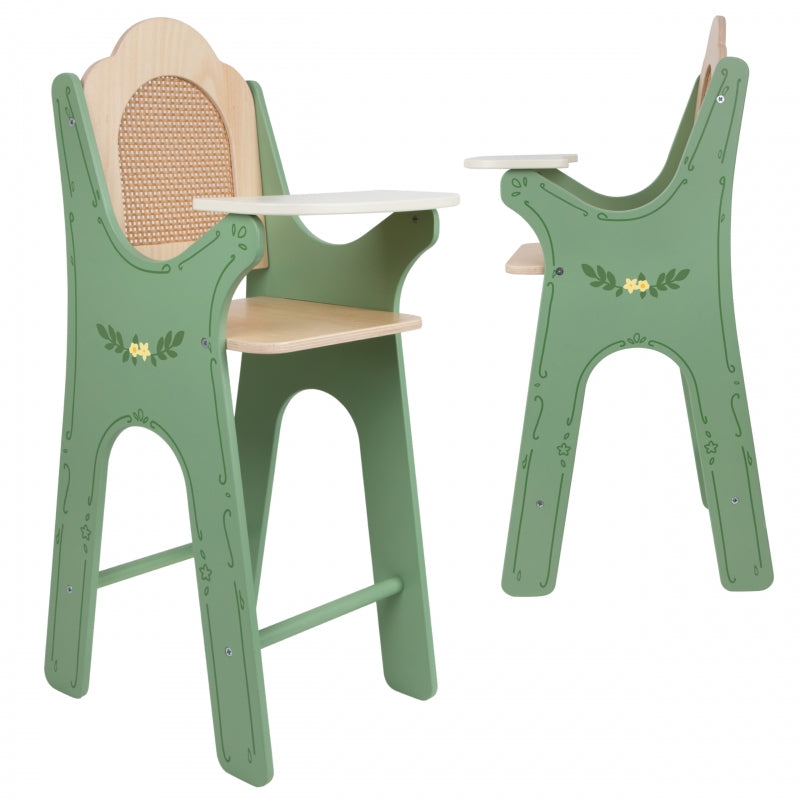 To eleganckie, wysokie krzesełko dla lalek to doskonały dodatek do zabawy w opiekę. Utrzymane w zielonej tonacji z subtelnymi kwiatowymi zdobieniami, nawiązuje do klasycznego stylu Vintage. Naturalny rattanowy splot w oparciu nadaje mu wyjątkowego uroku i autentycznego wyglądu. Idealnie sprawdzi się w zabawach tematycznych, rozwijając empatię i wyobraźnię dziecka.