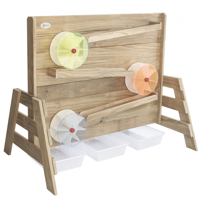 Drewniana Ściana "Zabawa Wodą" od renomowanej marki Classic World to idealne dopełnienie twojego placu zabaw. Produkt jest wyprodukowany z wysokiej jakości drewna, pomalowany nie toksycznym impregnatem, w pełni bezpiecznym dla dzieci. Należy nasypać piasek na drewnianą półkę i obserwować jak obsypuje się w dół, co będzie powodować obracanie się młynku. Z drugiej strony ścianki znajdują się tunele, do których można wlać wodę. Zabawa będzie pełnić funkcję nauki napędzania i wprowadzenia koła w ruch.