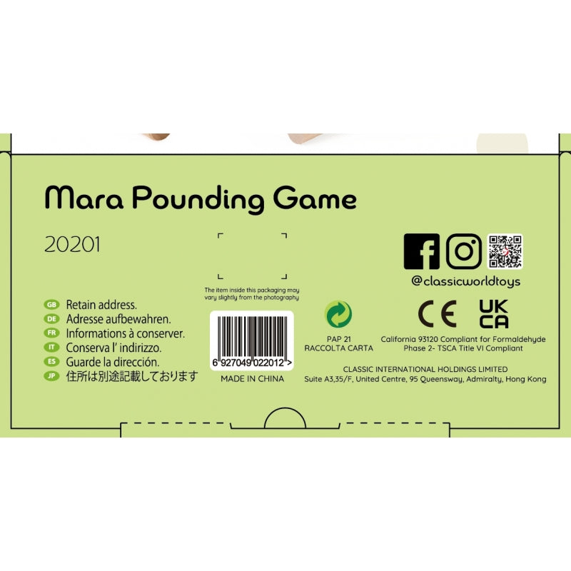 Plaats de zes gekleurde wortels in het houten frame. Zodra een wortel uit een gat omhoog komt, moet het kind deze precies en krachtig met de houten hamer terug ‘slaan’. Wanneer het goed lukt, valt de wortel uit het frame en verschijnt de volgende wortel om te slaan. Zo oefent je kleintje spelenderwijs zijn of haar motoriek en oog-handcoördinatie.
