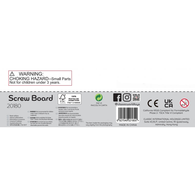 Drewniana tablica ze śrubkami od marki CLASSIC WORLD jest zabawką stworzoną z myślą o rozwoju dziecka poprzez dobrą zabawę. Gra polega na wkręcaniu śrubek do tablicy tworząc z nich różne kształty. Zestaw zawiera m.in. karty ze wzorami, które dziecko może wykonać w zabawie np. "na pamięć" razem z rodzicem. Dzieci rozwijają koordynację, koncentrację oraz siłę nadgarstka i dłoni poprzez wkręcanie. Karty testowe które zawierają gotowe wzory wzbogacają rozgrywkę. Dzieci mogą również bawić się z rodzicami w zapamiętywanie wzorów ułożonych przez rodziców. Maluchy mogą poprawić swoją zdolność rozpoznawania i rozróżniania kolorów i kształtów oraz wzmocnić umiejętności motoryczne.