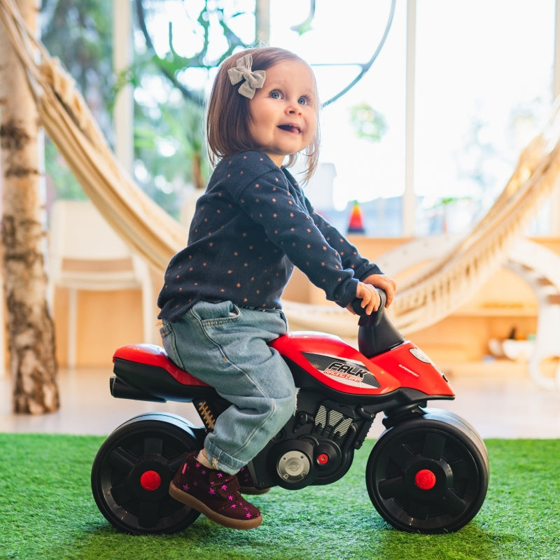 Motorek Biegowy od francuskiej firmy produkującej jeździki Falk to idealna propozycja na prezent dla dziecka od 2 roku życia. Piękna grafika i bardzo realistyczny wygląd sprawi wiele radości małym pociechom. Jeździk został wyposażony w duże koła, które sprawdzą się doskonale na różnych powierzchniach. Przednie kółko jest skrętne dla wygodniejszego prowadzenia i skręcania.