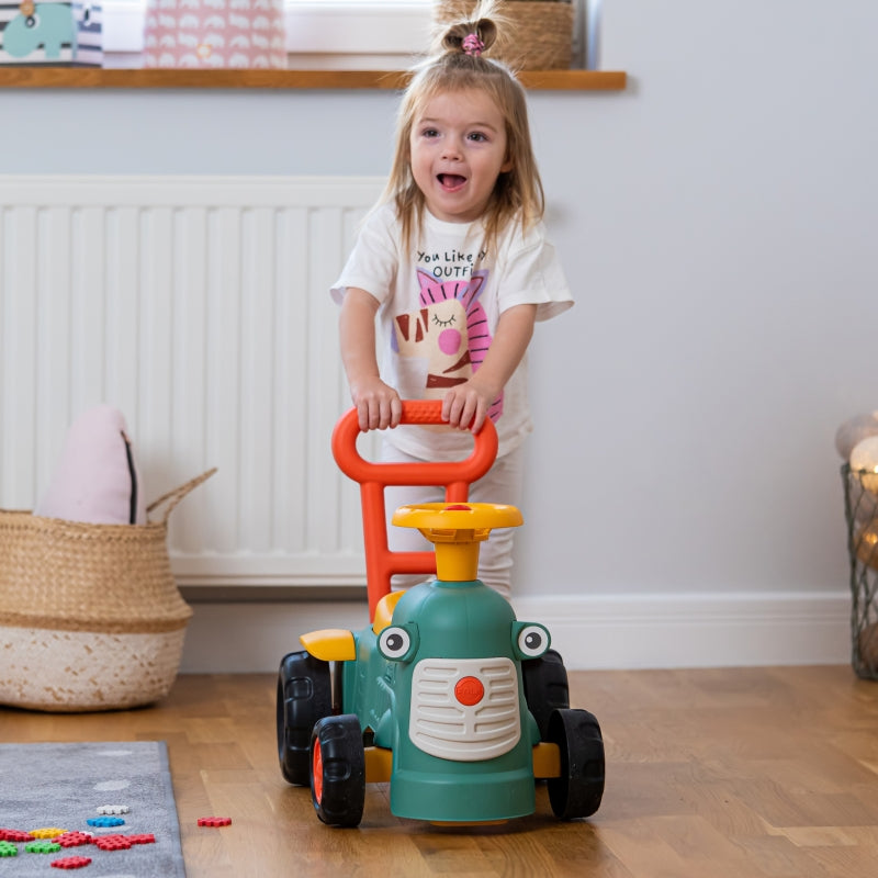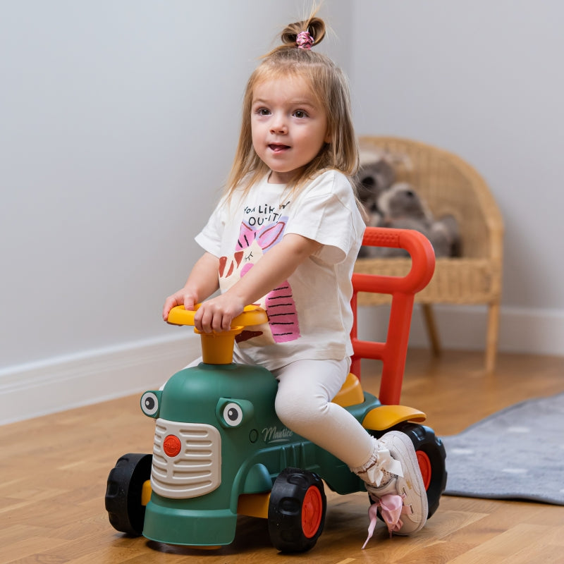 - jeździk pełni również funkcję pchacza, wspomagając naukę chodzenia u dziecka