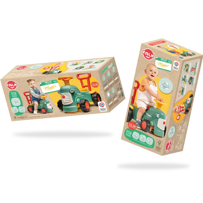 Maurice to uroczy traktorek francuskiej marki Falk, który będzie towarzyszem pierwszych kroków Twojego dziecka. Jasne kolory i zaokrąglone kształty zachwycą każdego malucha. Uruchamianie traktora za pomocą małego pokrętła dźwiękowego oraz dźwięk z klaksonu umieszczonego na kierownicy to wspaniała pierwsza nauka, która pobudzi umiejętności motoryczne i słuch Twojego dziecka. Jeżdżąc na jeździku, bawiąc się kierownicą z klaksonem i skrętnymi kołami dziecko będzie ćwiczyło koordynację i równowagę. Stojąc z tyłu, może korzystać z ergonomicznego oparcia, aby uczyć się chodzić przez zabawę, bez strachu i całkowicie bezpiecznie. Pod siedzeniem znajduje się niewielki schowek do przechowywania skarbów.