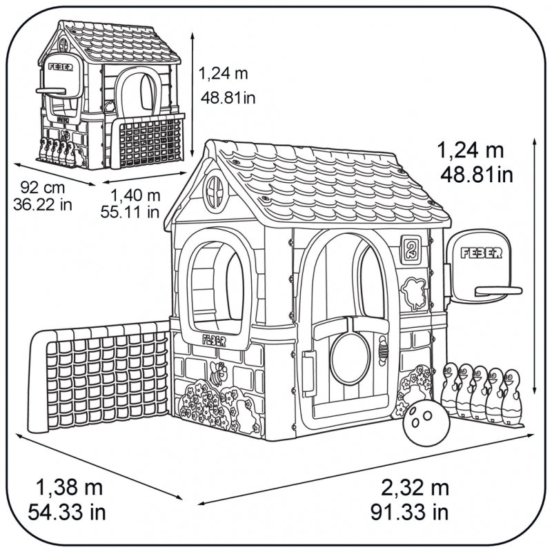 FEBER Dom Aktywności Wielofunkcyjny Domek 6 w 1 z Dołączonymi Grami to pierwszy domek do zabawy, który ma dołączone 6 gier, dzięki którym Twoja pociecha nie będzie wiedzieć co to nuda! Zestaw zawiera gry takie jak: kręgle, gry rakietowe, piłka nożna, koszykówka (z regulowanym koszem), tarcza do piłek na rzep. Po zakończonej zabawie można wszystko złożyć i nie ma bałaganu! Domek solidnie zbudowany, bardzo łatwy w montażu. Dodatkowo wyposażony w system ochronny przed promieniowaniem UV chroniący kolor przed wyblaknięciem. Przeznaczony dla dzieci powyżej 3 roku życia.