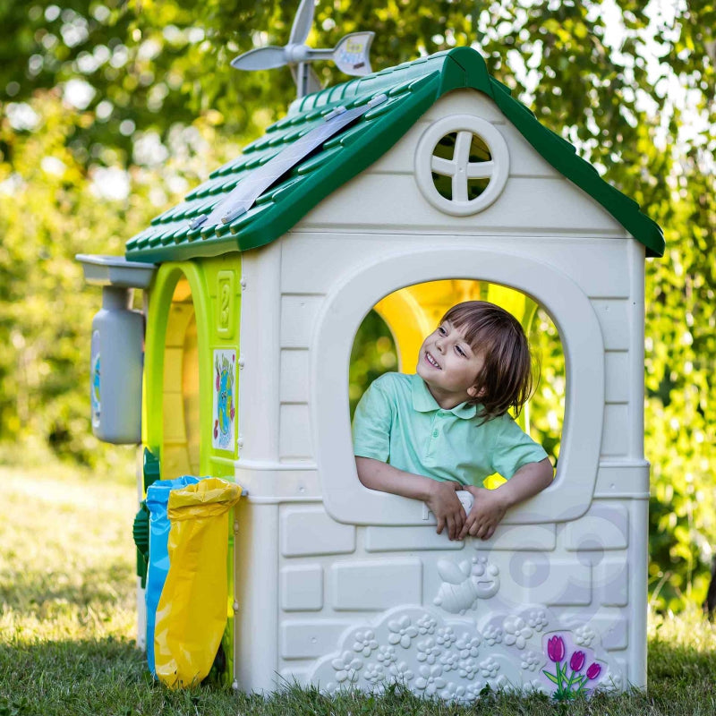 Domek FEBER ECO to domek zabaw, w którym znajdują się wszystkie aktywności potrzebne maluchom do wzbudzenia ciekawości w przyrodzie. Świetne miejsce i świetna nauka dla dzieci! W zestawie 2 kosze do recyklingu (żółty i niebieski), mały ogródek (w doniczkach) i narzędzia. To świetna aktywność na świeżym powietrzu dla dzieci. Można bawić się w sadzenie nasion i obserwowanie wzrostu roślin. Wyposażony jest również w gniazdo i karmnik dla ptaków. A woda deszczowa jest idealna do podlewania roślin lub kwiatów. Wiatrak i imitacja panelu słonecznego dają niesamowite funkcje do nauki o zrównoważonych energiach! Odporne, łatwe w montażu i wyposażone w system Anti UV zapobiegający utracie koloru i zwiększający odporność tworzywa.