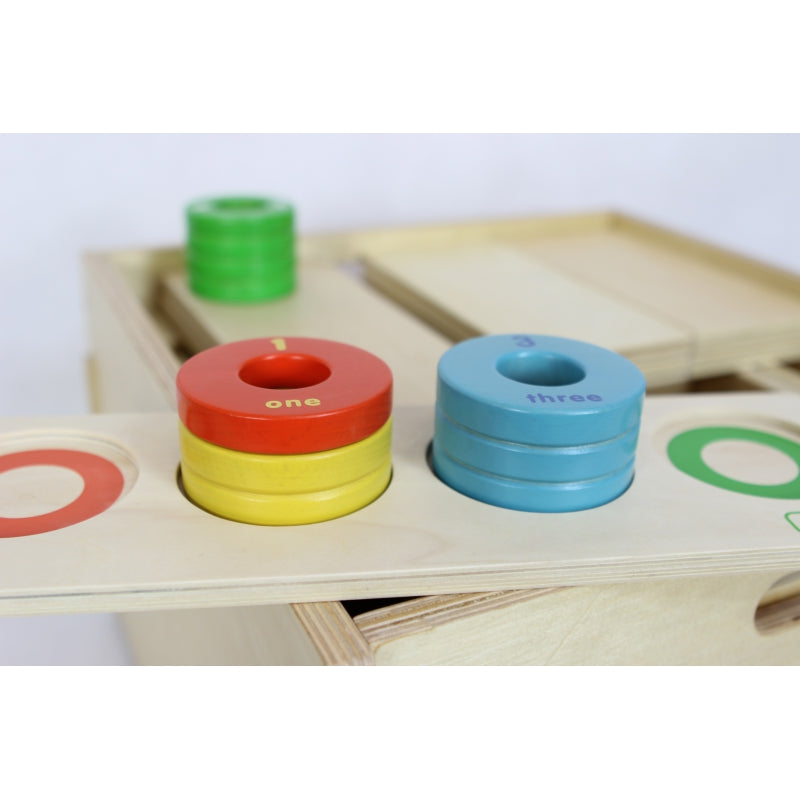 - drewniany sorter do rozpoznawania kolorów i nauki liczenia