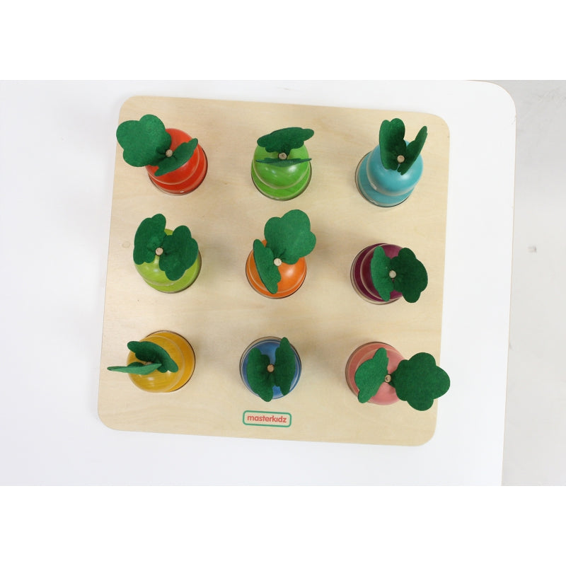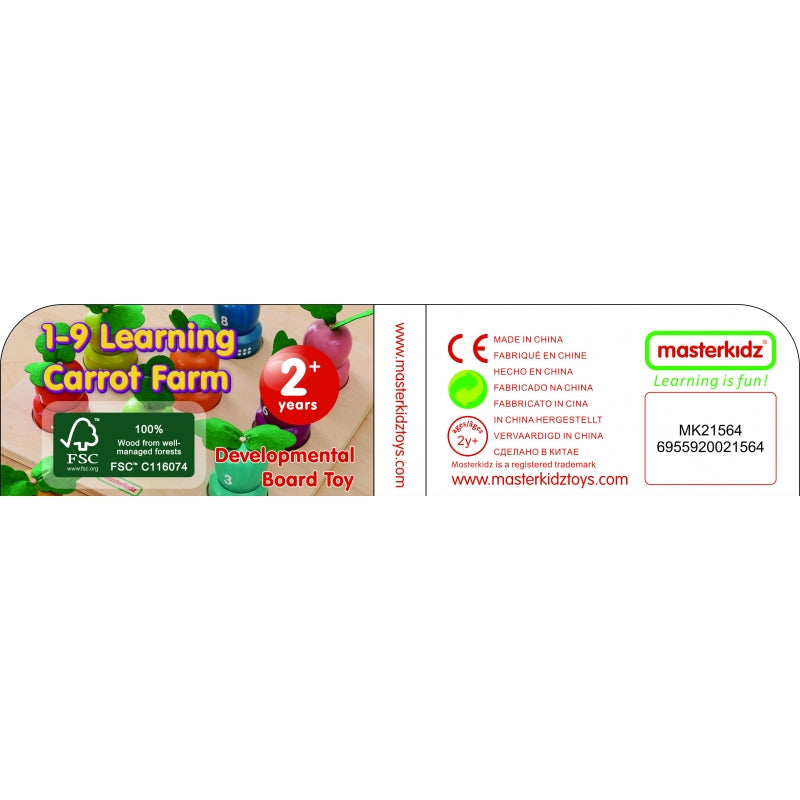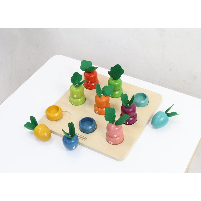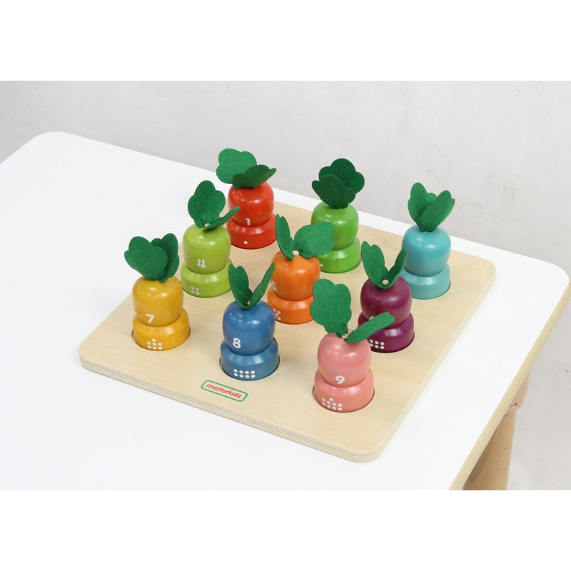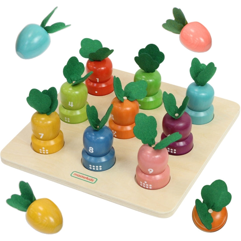 Een houten bord om getallen en kleuren te leren van het merk MASTERKIDZ. Dit bord is ontworpen om kinderen te helpen hun zintuigen te ontwikkelen. Kinderen moeten de juiste groente koppelen aan het aantal stippen en de kleur. Het bord ontwikkelt ook de fijne motoriek van kinderen.