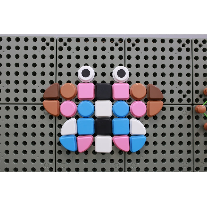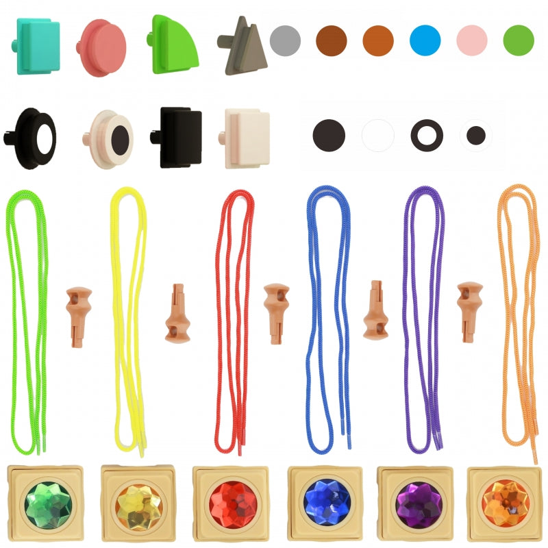- 64 geometrische pinnen (4 vormen, 6 kleuren)