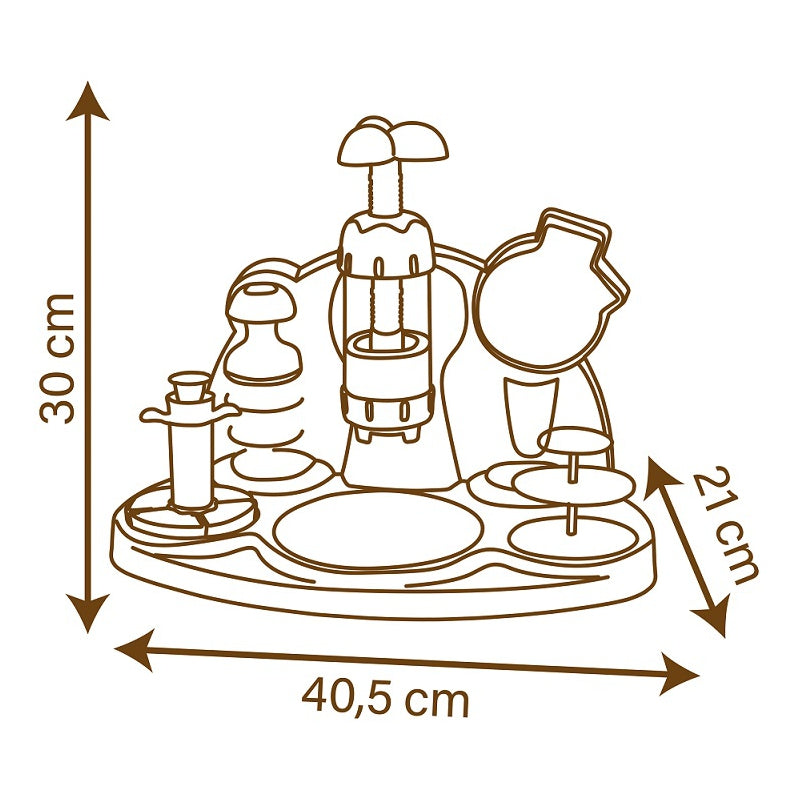 - zestaw zawiera maszynkę do robienia ciastek z 4 formami, stempel z różnymi końcówkami, strzykawkę do dekorowania, łyżeczki i pojemniczki na posypki.