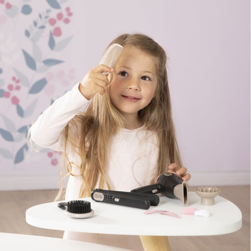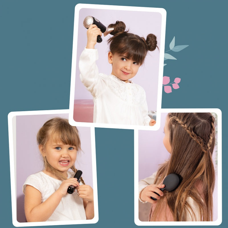 - w skład zestawu wchodzi suszarka, końcówki do suszarki, prostownica do włosów, szczotka, grzebień, spinki, gumki do włosów,
