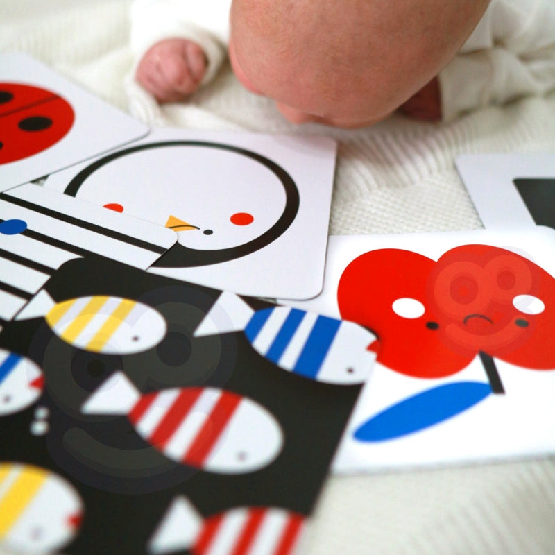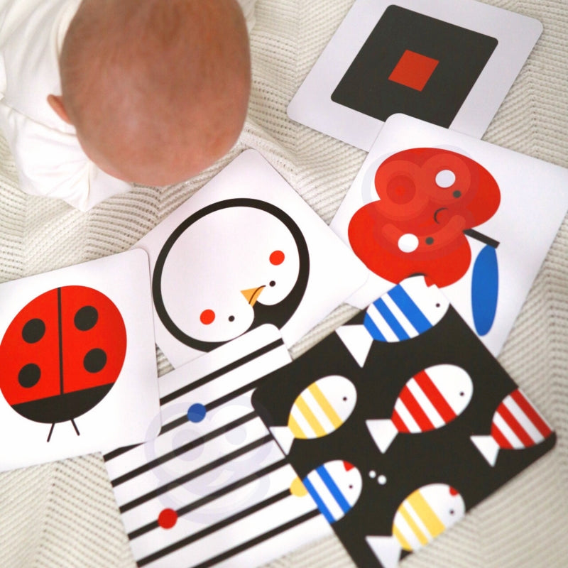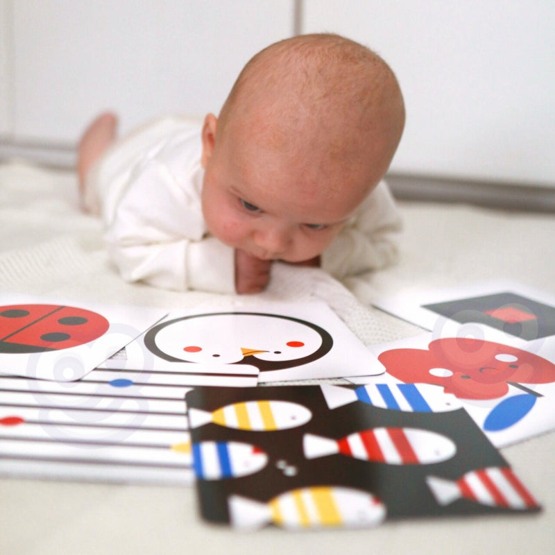 - Dubbelzijdige contrastkaarten kunnen vanaf de eerste weken van een baby's leven worden gebruikt. Hun belangrijkste doel is om het zicht van de baby te stimuleren, wat essentieel is direct na de geboorte. Grote afbeeldingen en contrasterende kleuren zorgen ervoor dat de baby zich op een bepaald object kan concentreren. Professionele oogartsen raden aan om contrastkaarten te gebruiken tijdens de kritieke periode van de visuele ontwikkeling van een baby – passende visuele stimulatie bevordert de activering van de rechterhersenhelft. Onderzoek toont aan dat het belangrijk is om tijd te besteden aan het kijken naar zwart-wit kaarten met een hoog contrast voor de cognitieve functies van een baby. Visuele stimulatie versterkt de verbinding tussen de ogen en de hersenen en bevordert de ontwikkeling.