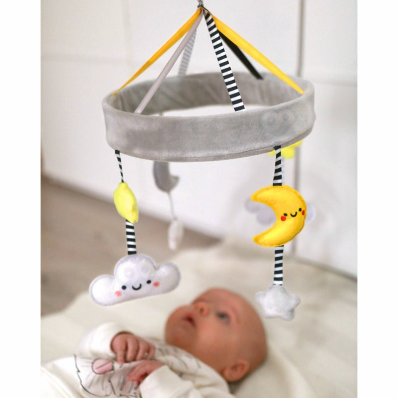 - "Night Sky" ledikantmobielen Ledikantmobielen zijn een van de belangrijkste accessoires die je baby kunnen helpen kalmeren en vermaken wanneer hij of zij rust nodig heeft. De "Night Sky" wiegmobiel heeft hangers in de vorm van een ster, maan en wolk. Deze charmante hangers zijn zacht, pluizig en behouden hun vorm, zelfs na herhaaldelijk wassen. Creëer een gevoel van veiligheid voor je kleintje tijdens de babytijd; het is het perfecte cadeau voor een pasgeboren baby! Het kiezen van de juiste wiegmobiel is niet alleen mooi om te zien; het heeft ook invloed op de ontwikkeling van je baby door zijn of haar zintuigen en verbeelding te stimuleren. De "Night Sky" wiegmobiel heeft de volgende effecten: - Kalmerend: Mobielen hebben een kalmerend effect op de baby dankzij hun zachte bewegingen, waardoor ze de aandacht van de baby trekken en hem of haar een gevoel van welzijn geven. - Ontwikkelingsstimulatie: Een mobiel kan de ontwikkeling van de visuele waarneming bij baby's stimuleren. Een pasgeborene die in een wieg ligt, strekt zijn of haar armen uit naar speelgoed en pakt het na verloop van tijd ook vast, wat de algehele motorische ontwikkeling bevordert. - In slaap vallen: De bewegingen van de mobiel helpen de baby te kalmeren en in slaap te vallen.