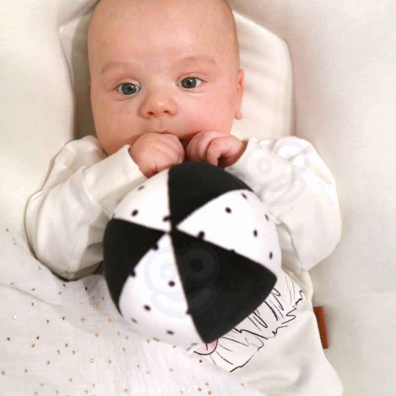 - Pluche contrastbal voor zichttraining. Contrastballen zijn een goede keuze voor baby's omdat ze hun gezichtsvermogen en interesse stimuleren. Buikligging is essentieel voor baby's omdat ze kernkracht moeten opbouwen om te kruipen en te lopen. Een zwart-witte stoffen bal kan je baby helpen bij het oefenen van grijpen en reiken terwijl hij op zijn buik ligt. De contrasterende zwart-witte kleuren trekken de aandacht van je baby en helpen bij de ontwikkeling van visuele vaardigheden. Het is ook een geweldig hulpmiddel om samen met je baby te spelen, waardoor de band tussen ouder en baby wordt versterkt.