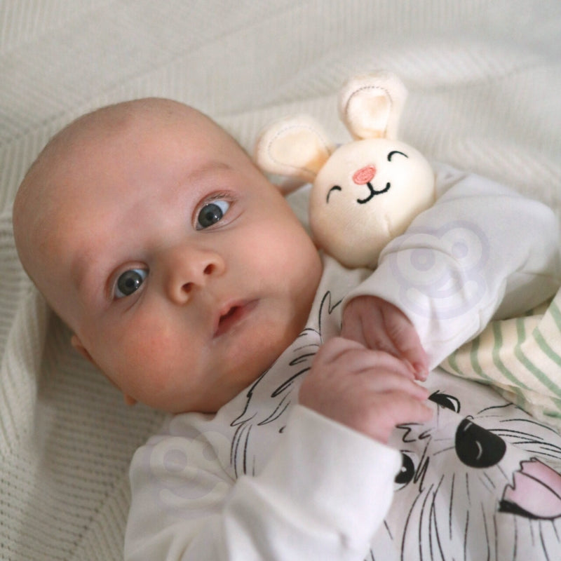 - Konijnensensorisch speeltje. Deze zachte en schattige knuffel houdt je baby gezelschap en wordt zijn of haar beste vriend. De eindeloze knuffels van dit schattige pluchen konijntje brengen vreugde in het leven van je baby en geven hem of haar een gevoel van veiligheid en comfort.