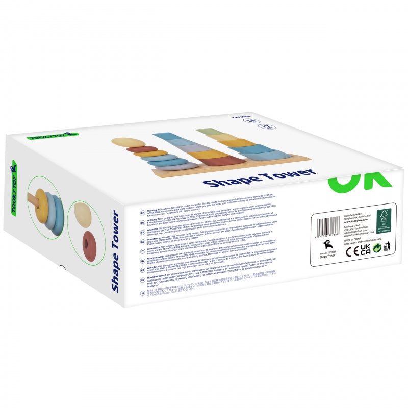 De Tooky Toy Drie Stapeltorens zijn uitstekend speelgoed voor kinderen van 18 maanden en ouder en bieden langdurig speelplezier. Ze bestaan uit 16 kleurrijke houten blokken in verschillende vormen en maten die gestapeld kunnen worden tot torens of andere bouwwerken. De set bevat ook een houten basis waarop drie kleurrijke piramides gestapeld kunnen worden. Dit spel ontwikkelt niet alleen de motoriek van kinderen, maar helpt hen ook om verschillende vormen en kleuren te leren kennen en hun vermogen om te classificeren op grootte. De doos, die tevens dienst doet als opbergdoos, is voorzien van een magneet, waardoor alle onderdelen van de set gemakkelijk te sluiten en op te bergen zijn.