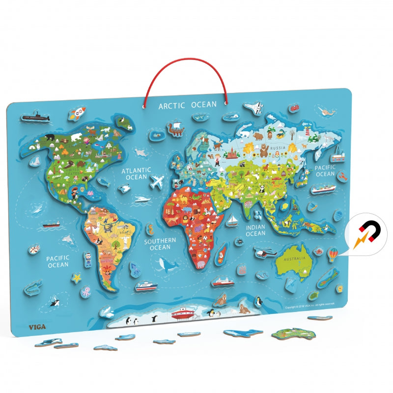 Tablica Edukacyjna 2w1 z magnetyczną Mapą Świata marki Viga, która jest jednocześnie tablicą do rysowania, to idealna zabawka dla ciekawych świata młodych odkrywców! Pięknie wykonana tablica z magnetycznymi elementami łączy walory edukacyjne z dobrą zabawą. Umieść drewniane elementy – kontynenty, statki, samoloty, rakiety oraz zwierzęta zamieszkujące dno oceanów. Mapa opisana językiem angielskim, doskonale wspomoże naukę języka angielskiego.
