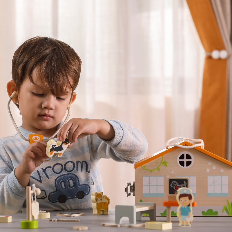 Drewniana kolorowa Klinika dla zwierząt w walizce od firmy Viga to jedna z czołowych zabawek, która pozwoli dziecku wejść do świata ciekawej i kreatywnej zabawy. Ten niesamowity zestaw pobudzi wyobraźnię Twojego dziecka. Sprawi, że maluch będzie mógł wcielić się w rolę weterynarza