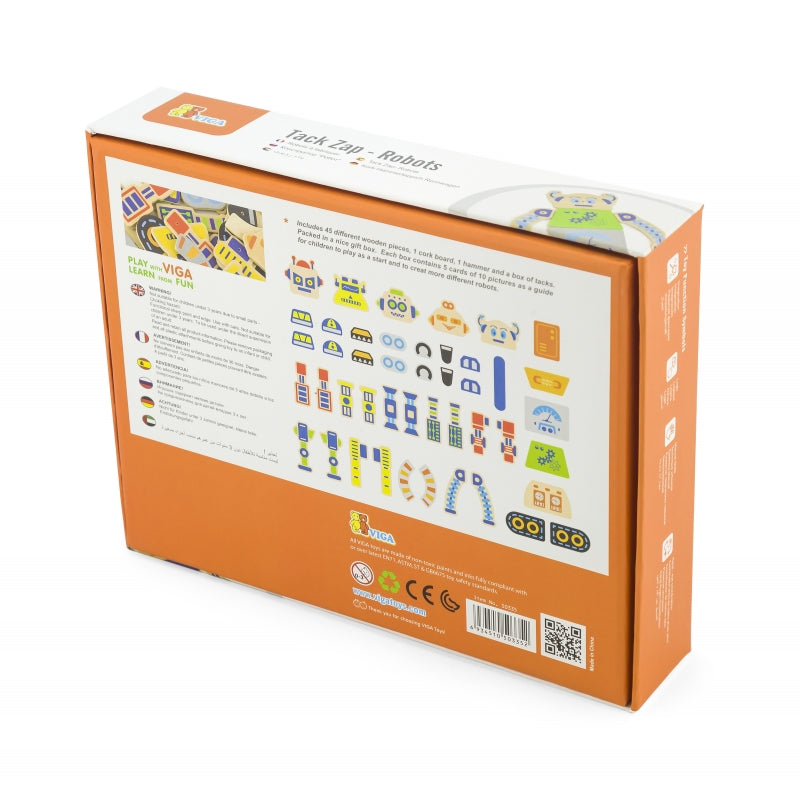 Przybijanka korkowa od marki VIGA to idealna tablica dla małego konstruktora. Zestaw zawiera 45 drewnianych elementów do przybijania, korkową tablice, drewniany młoteczek oraz 5 kart, które przedstawiają 10 przykładowych robotów jakie można ułożyć z klocków. Każdy drewniany element posiada otwór, dzieki czemu dziecko, za pomocą pinezek, może wbić dowolny kształt do tablicy. Dziecko może układać zgodnie ze swoja wyobraźnią i kreatywnością. Korkowe przybijanki to zabawki wspierające rozwój umiejętności manualnych, logicznych oraz koncentracji. Elementy posiadają zaokrąglone krawędzie przez co są w 100% bezpieczne dla dzieci.