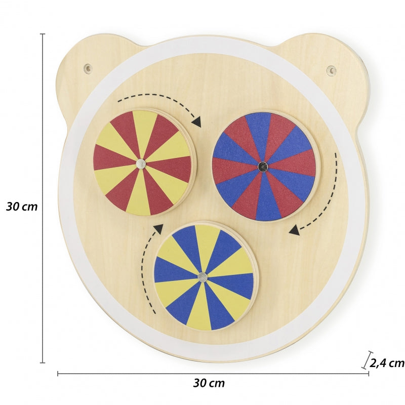 Jedna z serii drewnianych tablic z uroczą głową misia. Tablica z trzema kółkami, które zostały odpowiednio pomalowane, aby poprzez kręcenie wywoływać złudzenia optyczne. Zabawka pomaga w rozwijaniu logicznego myślenia u dzieci, pomaga również w nauce kolorów. Produkt idealnie sprawdzi się zarówno w domowym zaciszu, jak i w placówkach oświatowych, wczesnoszkolnych. Ciekawe przygotowanie formy tablicy z pewnością przykuje uwagę każdego malucha. Całość wykonana została z drewna lakierowanego i pomalowana nietoksycznymi farbami w żywe barwy, które zadowolą każdego użytkownika i dadzą mnóstwo radości z zabawy. Produkt przeznaczony dla dzieci od 18 miesiąca życia. W naszej ofercie dostępna jest cała seria tablic z głową misia.Charakterystyka: