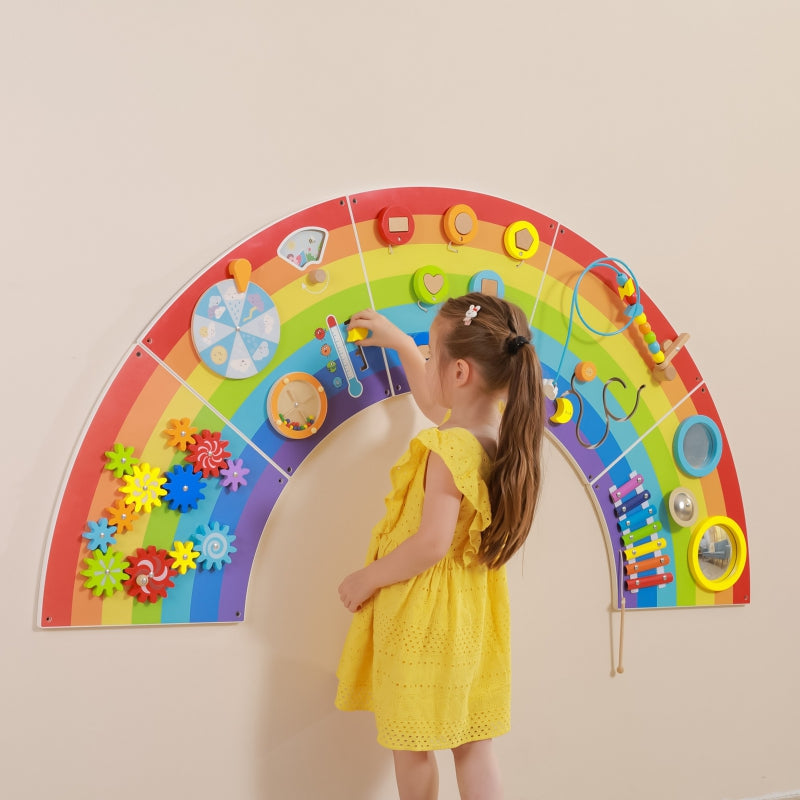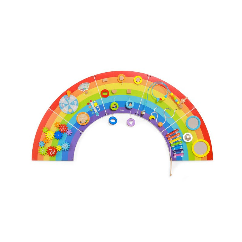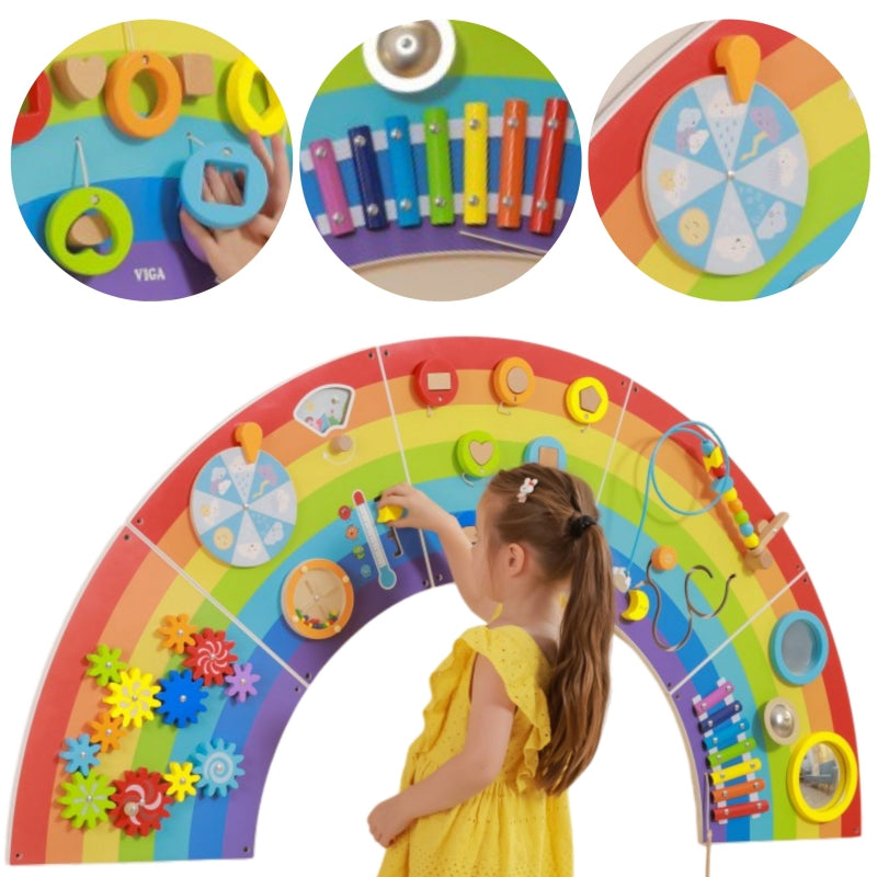 Tablica Sensoryczno - Manipulacyjna Tęcza marki Viga Toys to drewniana, wielofunkcyjna zabawka na ścianę, która zapewni dzieciom godziny świetnej zabawy. Wśród różnych aktywności znajdziesz tutaj 12 czynności: obracające się koła zębate, tablicę pogody, toczący się dysk, dopasowanie klocków, ksylofon, wklęsłe i wypukłe lustro, gong i przeplatanka koralików. Tablica pogody została specjalnie zaprojektowana, aby pasowała do motywu tęczy. Zmieniający się panel pór roku można badać w połączeniu ze zmianami pogody i wahaniami temperatury. Podzielony na 5 części dla łatwego transportu i montażu. Wszystkie 5 części są tej samej wielkości, dzięki czemu można je montować w dowolnej kolejności. Zakrzywiona konstrukcja zachęca dzieci o różnym wzroście do jednoczesnej zabawy i nauki podstawowych pojęć dotyczących kolorów, kształtów, dźwięków i pogody. Zabawka została zaprojektowana tak, aby stymulować zmysły i wspierać rozwój motoryki dziecka. To doskonałe ćwiczenie zręczności małych paluszków. Zabawka uczy również logicznego myślenia oraz cierpliwości. Idealne uzupełnienie środowiska wczesnej nauki i placówek opieki nad dziećmi.