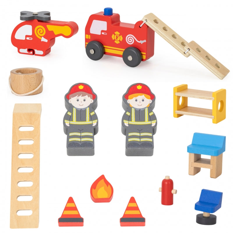 ◾ Drewnianą 3-piętrową remizę strażacką◾ Wóz strażacki◾ Helikopter strażacki z pojemnikiem na wodę◾ 2 figurki strażaków◾ Element płomienia do gaszenia◾ 2 Pachołki drogowe◾ Gaśnicę◾ Meble remizy: łóżko, biurko, krzesło