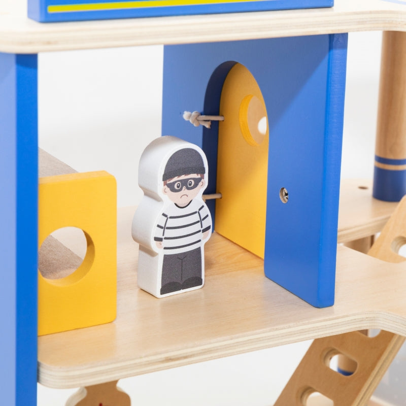 ◾ Drewniany posterunek policji◾ Radiowóz◾ Helikopter policyjny◾ Figurki: 2 policjantów, złodzieja i psa policyjnego◾ 2 pachołki drogowe
