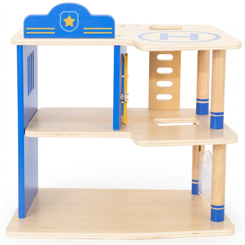 ✔️ Dla dzieci od 3 roku życia✔️ Wykonany z wysokiej jakości drewna✔️ Parter wyposażony w strzelnicę✔️ Drugie piętro z celą dla przestępców ✔️ Trzecie piętro z lądowiskiem dla helikoptera policyjnego