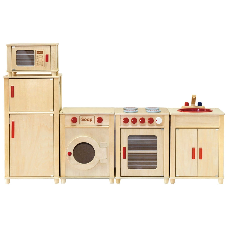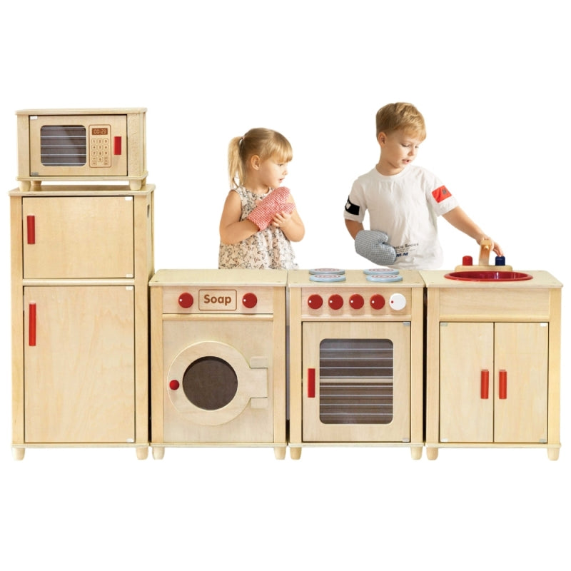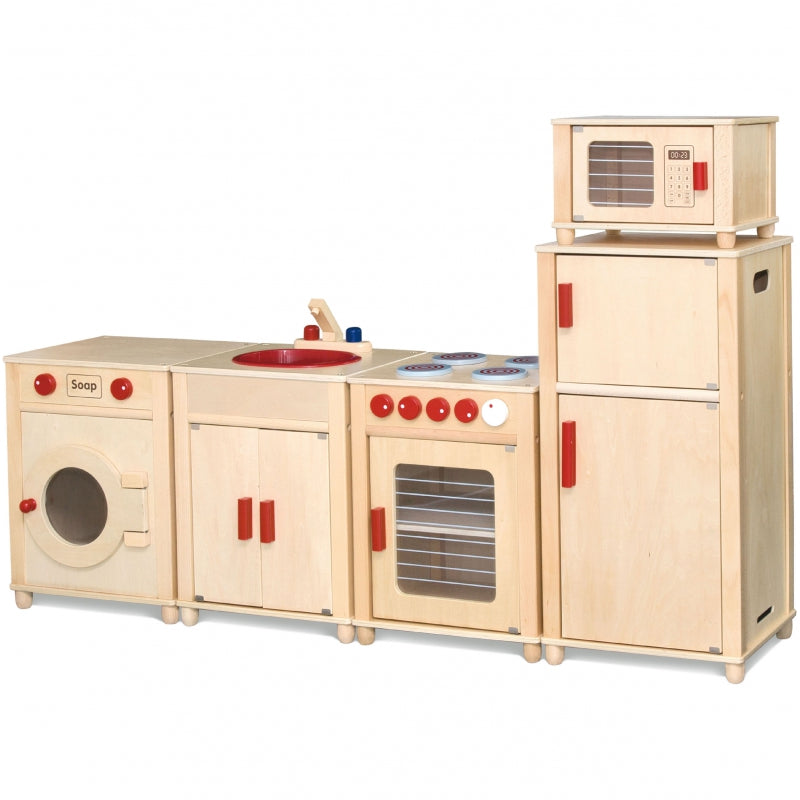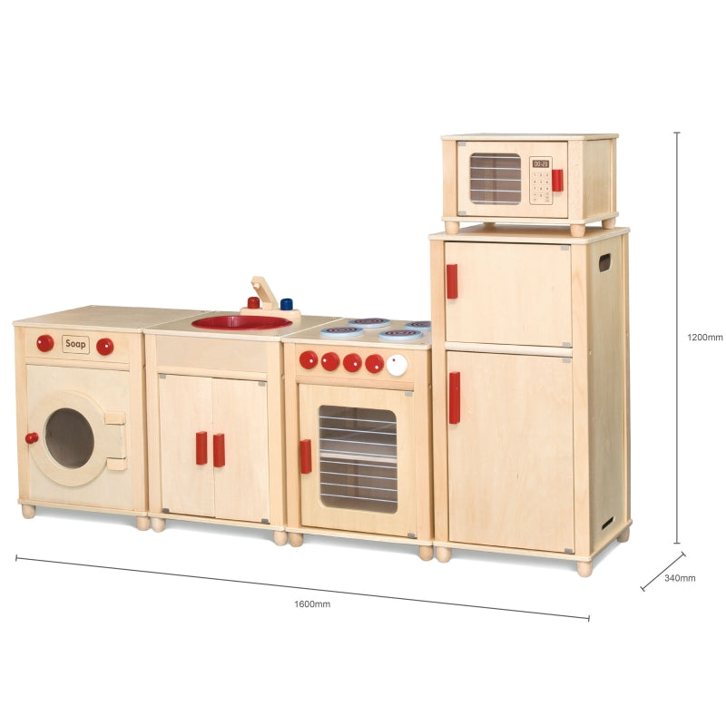 Drewniany Ogromny Zestaw Kuchenny Natural dla dzieci od marki Viga pozwoli na zabawę kilkoro dzieci jednocześnie. Komplet idealnie sprawdzi się jako kącik zabaw dla dzieci od 3 roku życia. Kuchnia składa się z kuchenki z piecykiem, szafki ze zlewem, lodówki, kuchenki mikrofalowej oraz pralki. Wykonane z drewna bukowego oraz sklejki brzozowej mebelki można ustawić w dowolnej kolejności. Szerokość każdego z segmentów wynosi 40 cm a ich głębokość to 34 cm. Całkowita szerokość zestawu wynosi 160 cm, wysokość od ziemi do blatu to 53 cm a wysokość całkowita wynosi 120 cm. Zestaw do samodzielnego montażu według załączonej instrukcji krok po kroku.