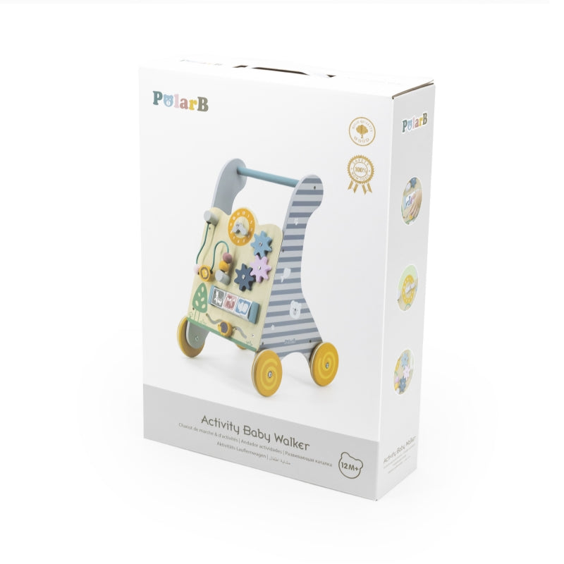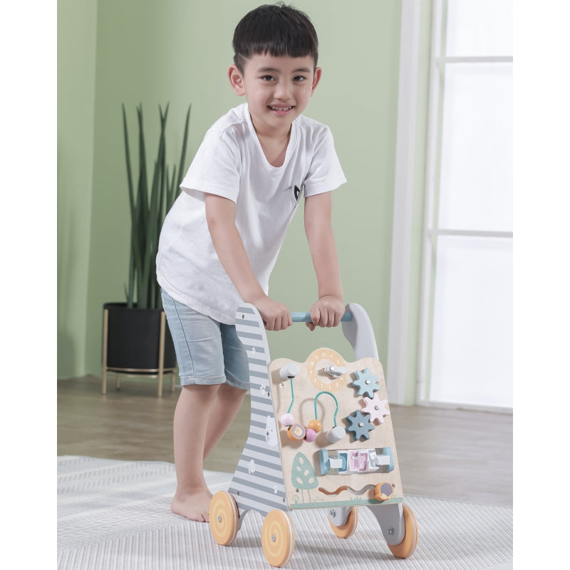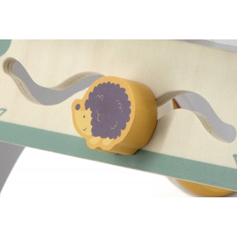 Pchacz edukacyjny dla dzieci zaprojektowany przez cenionego producenta zabawek Viga Toys. Zabawka przeznaczona dla dzieci od 18 miesiąca. Funkcyjna zabawka dla najmłodszych pełni jednocześnie rolę chodzika oraz panelu edukacyjnego dzięki, któremu dziecko uczy się dopasowywania kształtów i kolorów. Obrotowe elementy w postaci kółek zębatych, tory ze zwierzątkami na panelu oraz jego bokach zaciekawią maluszka i uatrakcyjnią zabawę.Bezpieczeństwo oraz stabilność zapewnią szeroko rozstawione kółka pokryte gumą antypoślizgową (nie rysuje podłóg) oraz drewniana rączka.Panel przedni zawiera: