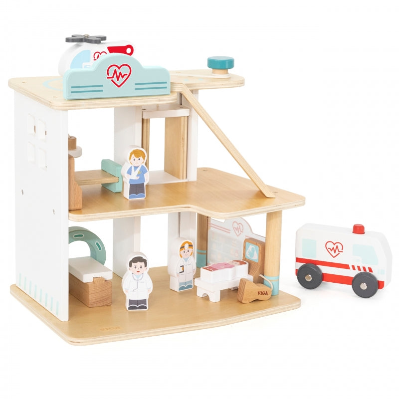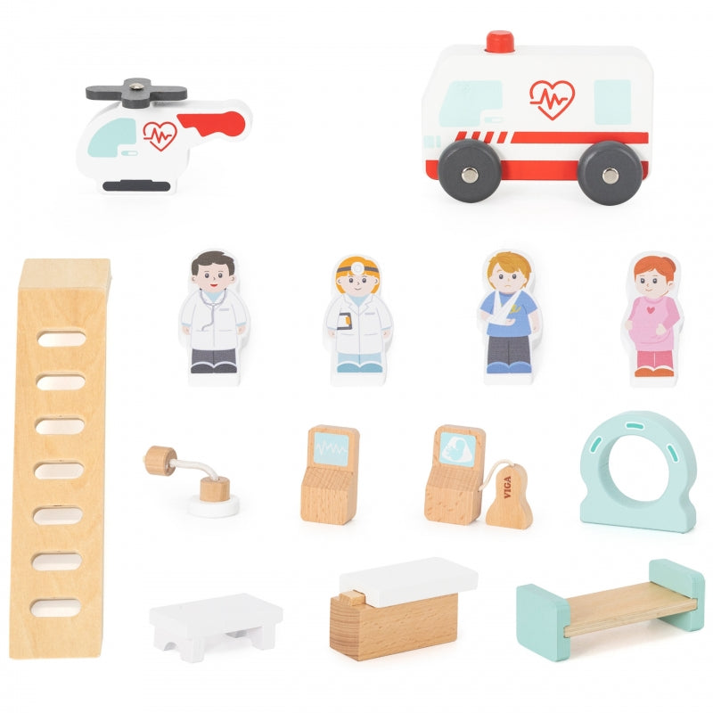 VIGA Drewniany Szpital Z Karetką Winda Zestaw 15 el