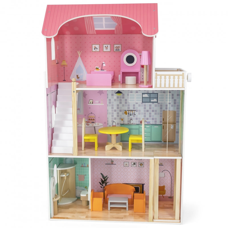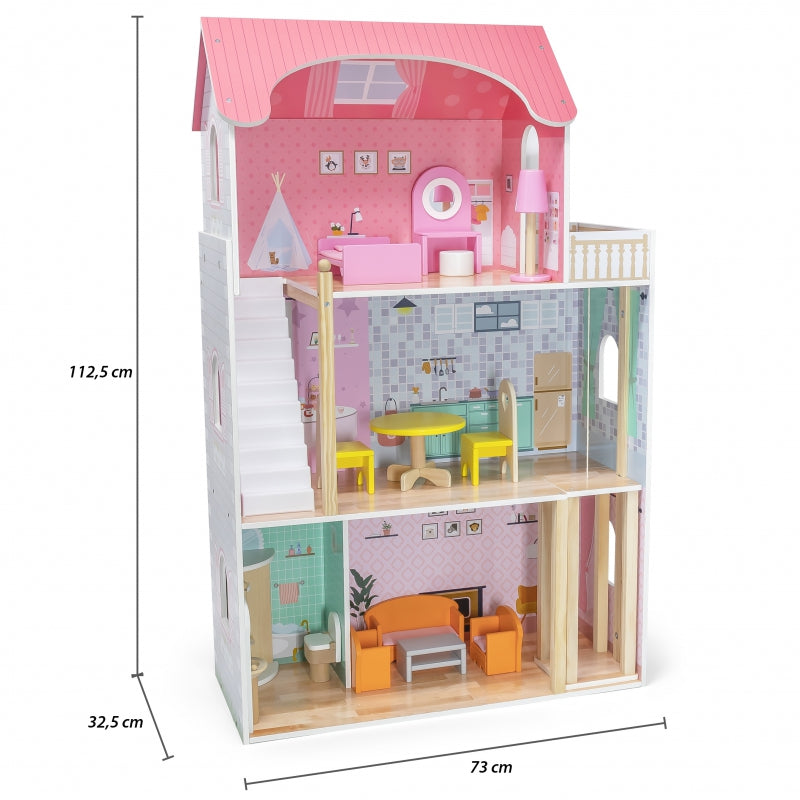 Drewniany domek dla lalek to idealna zabawka dla dziewczynek. W domku znajdziemy wiele pomieszczeń, dzięki czemu każda dziewczynka może odgrywać każdą rolę swoimi małymi laleczkami, figurkami, czy misiami.