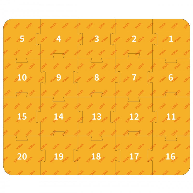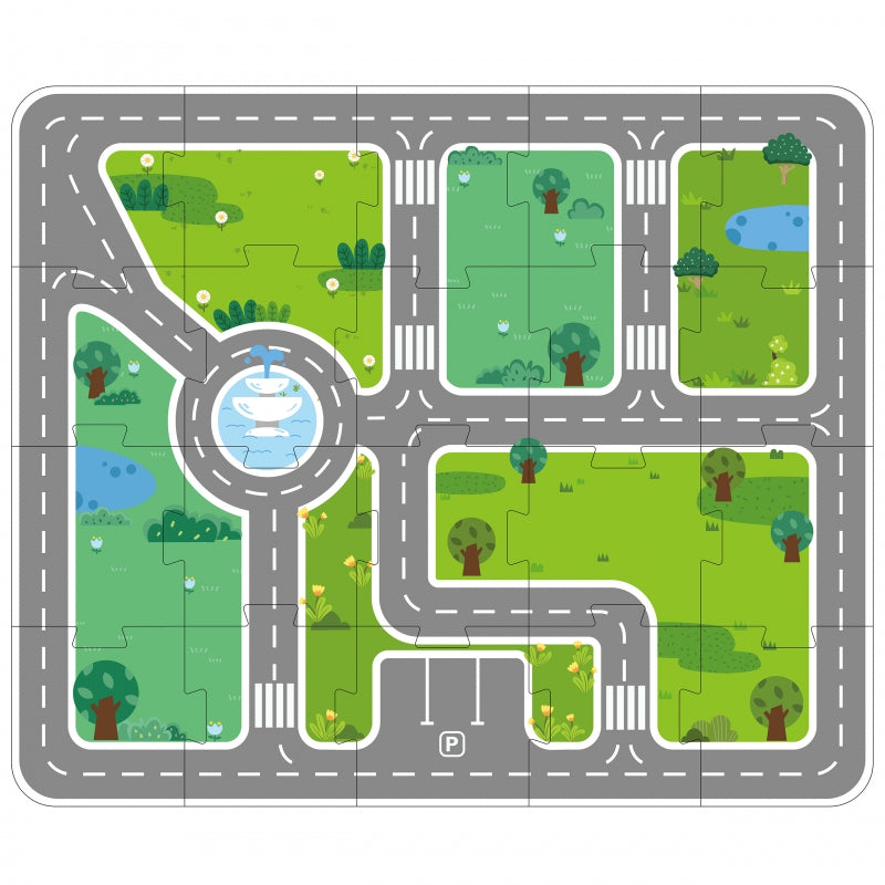 - 20 puzzelstukjes om het bord waarop de stad wordt gebouwd in elkaar te zetten