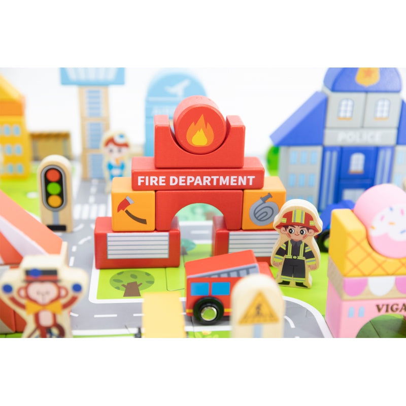 De houten stadsbouw set is het perfecte speelgoed voor beginnende architecten die hun eigen stadsplattegrond willen maken. Vouw het model open en gebruik blokken in verschillende vormen en prachtige kleuren om een stad te bouwen! De set bevat 60 blokken waarmee je een school, ziekenhuis, politiebureau, brandweerkazerne, luchthaven, banketbakkerij en circus kunt bouwen, en deze vervolgens overal op het stadsbord kunt plaatsen. Naast de gebouwen zelf bevat de set 5 voertuigen, 6 figuurtjes van personages uit verschillende beroepen die overeenkomen met de stadsgebouwen, en extra accessoires, zoals verkeersborden en bomen. Alles is handig verpakt in een emmer voor eenvoudige opslag.