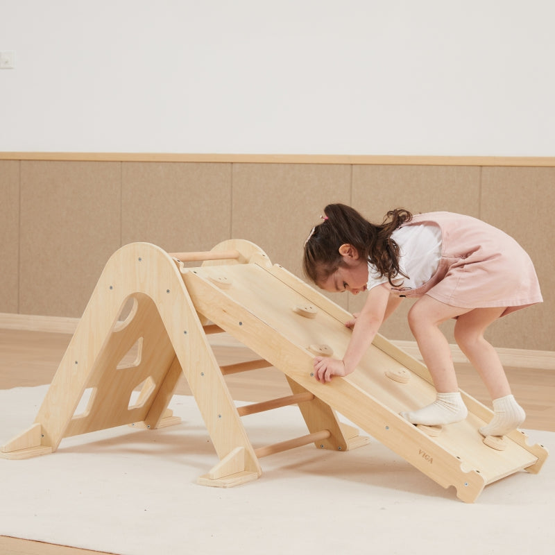 De Pikler Klimdriehoek is een essentieel onderdeel van een thuisspeelplaats, geheel in lijn met de Montessorifilosofie. Tijdens het klimmen ontwikkelen kinderen hun grove motoriek, evenwichtsgevoel en lichaamscoördinatie. Het beklimmen van de ladder dient te gebeuren onder begeleiding van een volwassene. Aan de ene kant vinden kinderen een klassieke ladder, terwijl aan de andere kant een muur met verschillende klimgaten is.