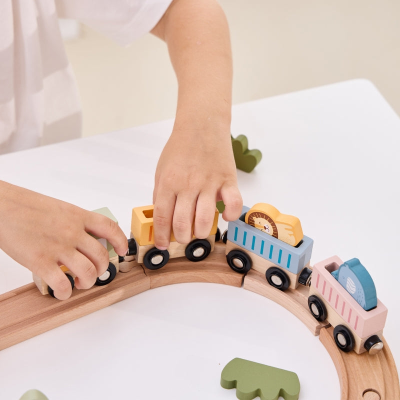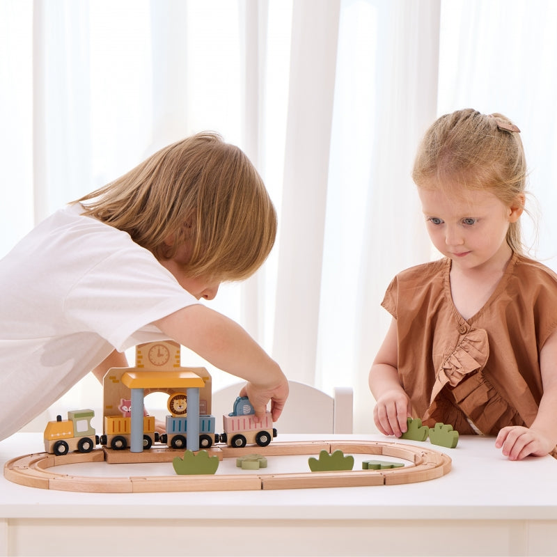 De Houten Treinset (30 stuks) is een geweldige optie voor kleine treinliefhebbers! Hij bevat 30 elementen, waaronder verschillende rails, een interactief station en accessoires waarmee je je eigen speelscenario's kunt creëren. Bovendien maakt het meegeleverde boekje met handleiding het eenvoudig om een realistisch stationsdecor te bouwen. Dankzij de geluidsfunctie, die magnetisch wordt geactiveerd wanneer de trein door het station rijdt, wordt het spel nog leuker. De houten elementen zijn stevig en duurzaam, en hun veelzijdigheid stimuleert kinderen om vrij en creatief te spelen.
