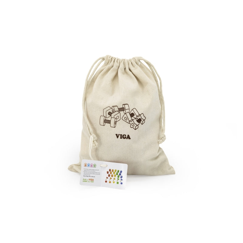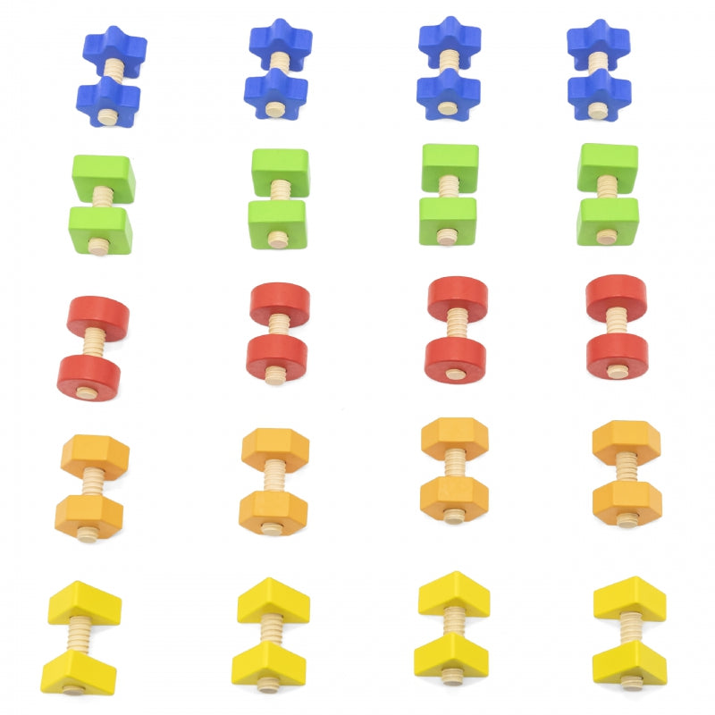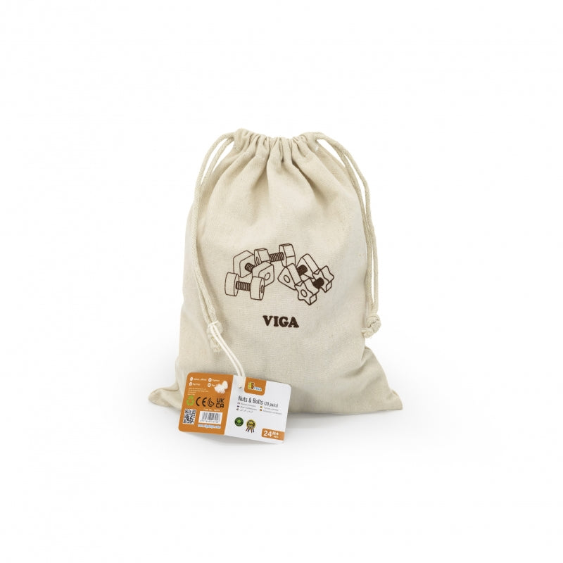 Bouten en Moeren is een VIGA-behendigheidsspeelgoed waarbij kleurrijke vormen worden vast- en losgedraaid. Het is erg leuk voor kinderen om te mixen en matchen, terwijl ze tegelijkertijd leren tellen, kleuren en vormen. Het vast- en losdraaien verbetert hun behendigheid en visuele coördinatie. De set bevat 40 onderdelen, 20 paar bouten en moeren in 5 felle kleuren en vormen, en een katoenen opbergzakje.