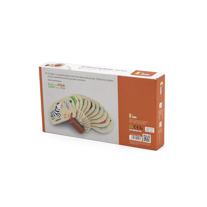 Dit alfabetleerboekje, ontworpen door het gerenommeerde houten speelgoedmerk Viga Toys, is ideaal voor kinderen vanaf 12 maanden. Perfect voor zowel thuis als in de kleuterklas. De houten kaartjes zijn aan elkaar verbonden met een rood koord. Op elk kaartje staat een andere letter, een bijbehorend plaatje en het volledige woord in het Engels.