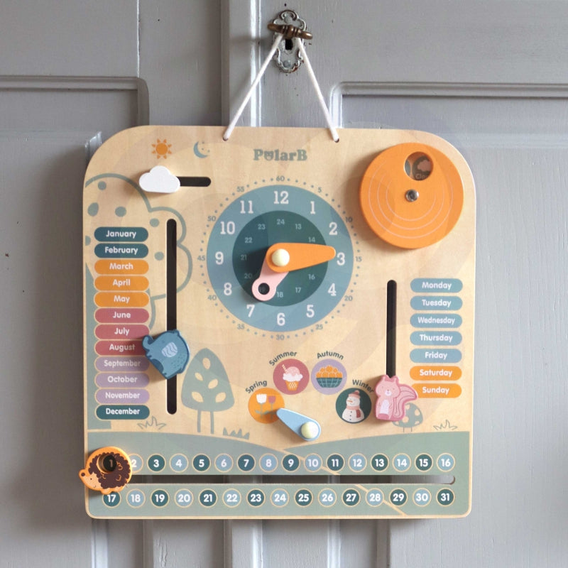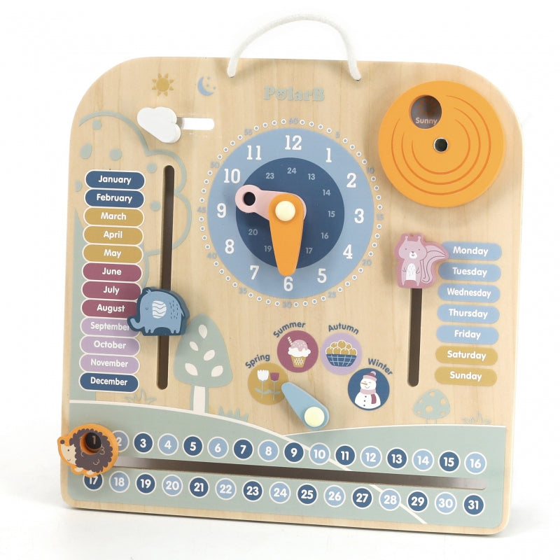 - drewniana zabawka z zegarem i oznaczeniami: dni tygodnia, miesięcy, pór roku oraz pogody,