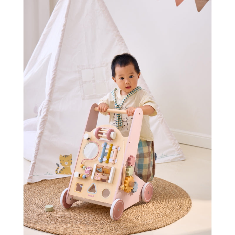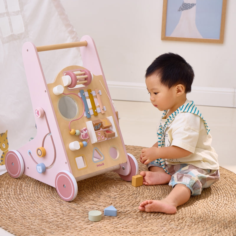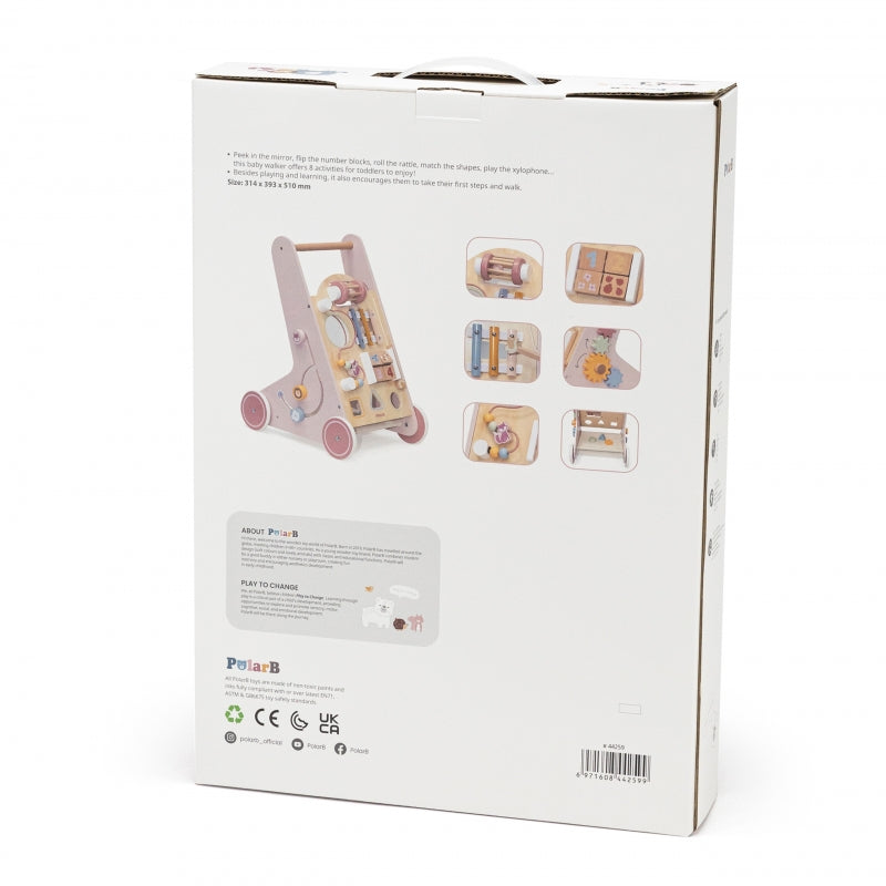 Różowy Chodzik dla Maluszków od marki PolarB to świetna zabawa i nauka w jednym! Oferuje interaktywne aktywności, takie jak podglądanie się w lusterku, obracanie klocków, turlanie grzechotki, dopasowywanie kształtów oraz granie na cymbałkach. Dzięki temu chodzik zachęca dzieci do stawiania pierwszych kroków, co jest kluczowym etapem w ich rozwoju. Dodatkowo, z tyłu znajduje się praktyczny schowek, idealny na ulubione zabawki.