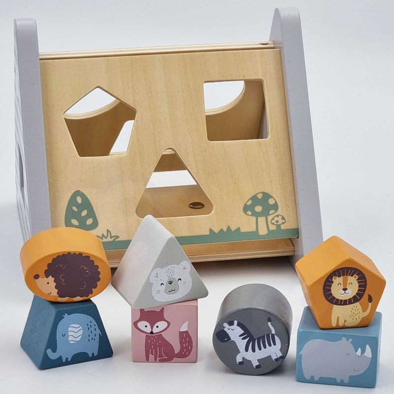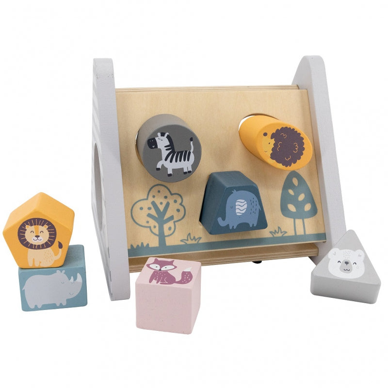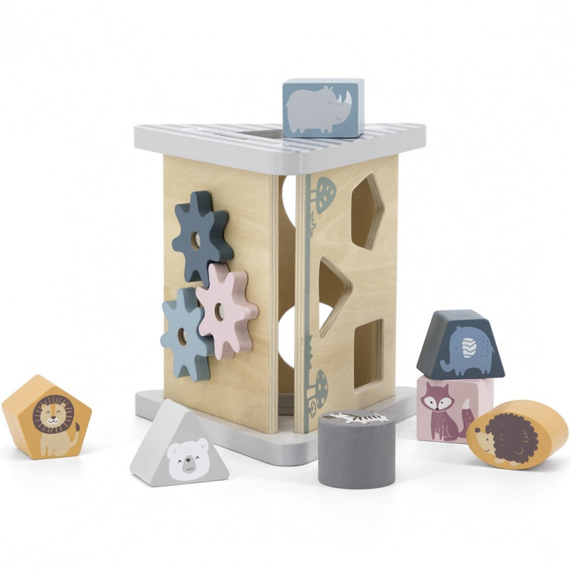 - zadaniem dziecka jest dopasowywanie kształtów klocków, na których umieszczone zostały kolorowe postaci zwierząt i wciśnięcie w odpowiedni otwór, aby przeszły na drugą stronę pięciu drewnianych boków układanki w kształcie piramidki pokrytej rysunkami,