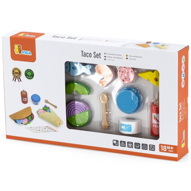 VIGA Zestaw Meksykańskich Potraw Taco i Burrito to zestaw 27 elementów dla małych kucharzy, którzy chcą przygotować swoje własne pyszne taco i burrito! Zabawka zapewnia realistyczną zabawę w gotowanie, rozwija wyobraźnię i umiejętności manualne, a także uczy dzieci rozpoznawania składników i tworzenia kulinarnych kompozycji.