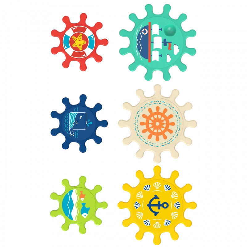 Kolorowe zębatki od marki Woopie to zabawka umilająca dzieciom czas podczas kąpieli. Zestaw składa się z 6 kolorowych trybików w dwóch wielkościach. Przyssawki znajdujące się przy każdym trybiku umożliwiają przymocowanie go do płytek, wanny czy prysznica, w taki sposób aby elementy zazębiały się. Dziecko podczas zabawy ruszając jeden element wprawia w ruch całą zbudowaną przez siebie konstrukcję. Maluch bawiąc się poznaje zasadę przyczynowo - skutkową, rozwinie zmysły a kolorowa morska grafika zachęci do zabawy i urozmaici zabawę pod prysznicem lub w wannie.