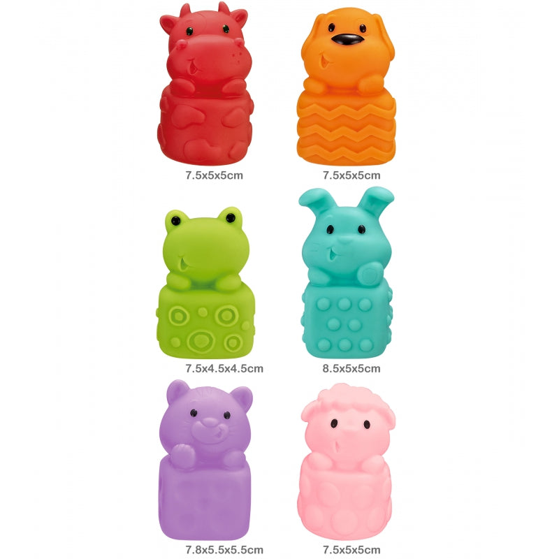 Gumowe, sensoryczne zwierzątka od marki WOOPIE, którymi można bawić się w wodzie. Zwierzątka takie jak hipcio, owieczka, królik, kotek, żabka, piesek są wykonane z miękkiej gumy, posiadają otwór dzięki, któremu można psikać wodą. Każdy ze zwierzaków jest usytuowany na podstawce, która posiada wypustki.