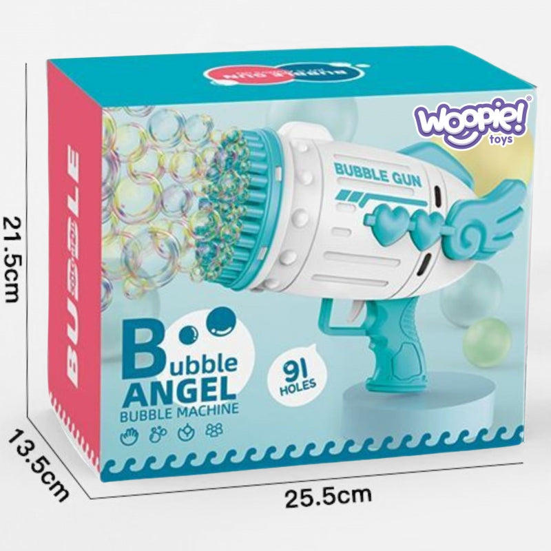 Het WOOPIE zeepbellenpistool is een fantastische speelgoedmachine in de vorm van een pistool, perfect voor kinderen vanaf 3 jaar. Dankzij de maar liefst 91 gaatjes schiet het pistool razendsnel een enorme hoeveelheid zeepbellen de lucht in, wat zorgt voor een spectaculair en magisch effect waar zowel kinderen als volwassenen van genieten.