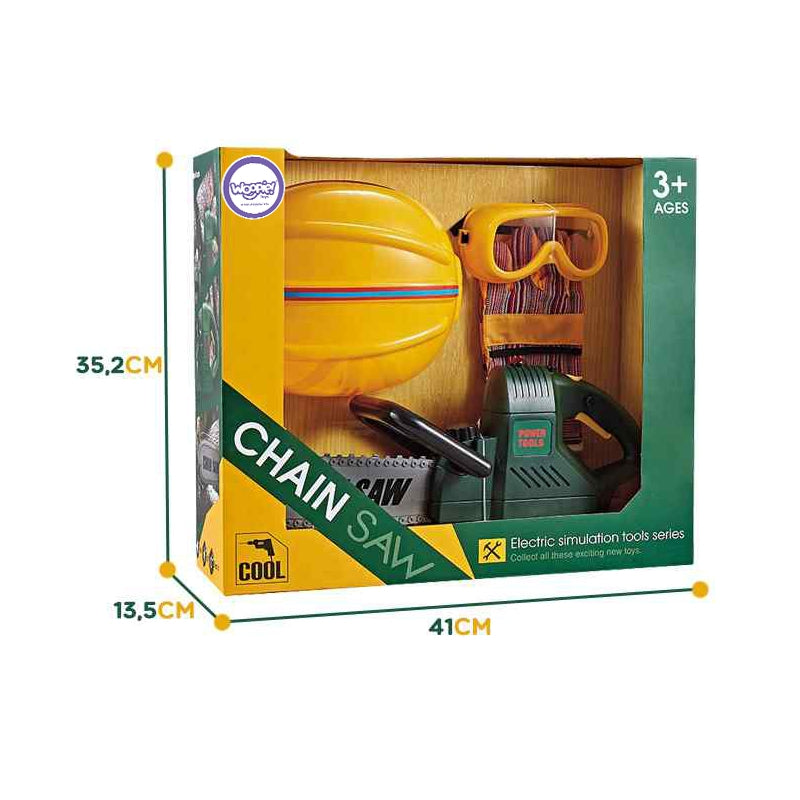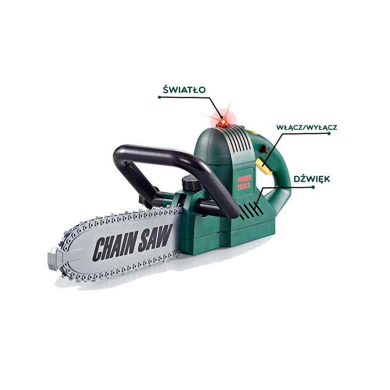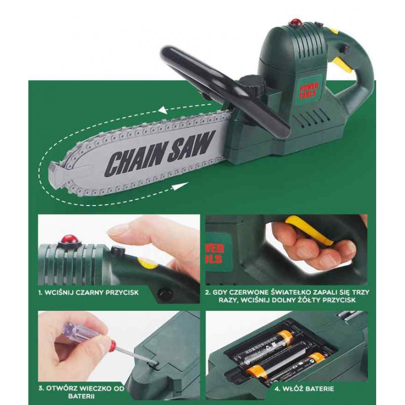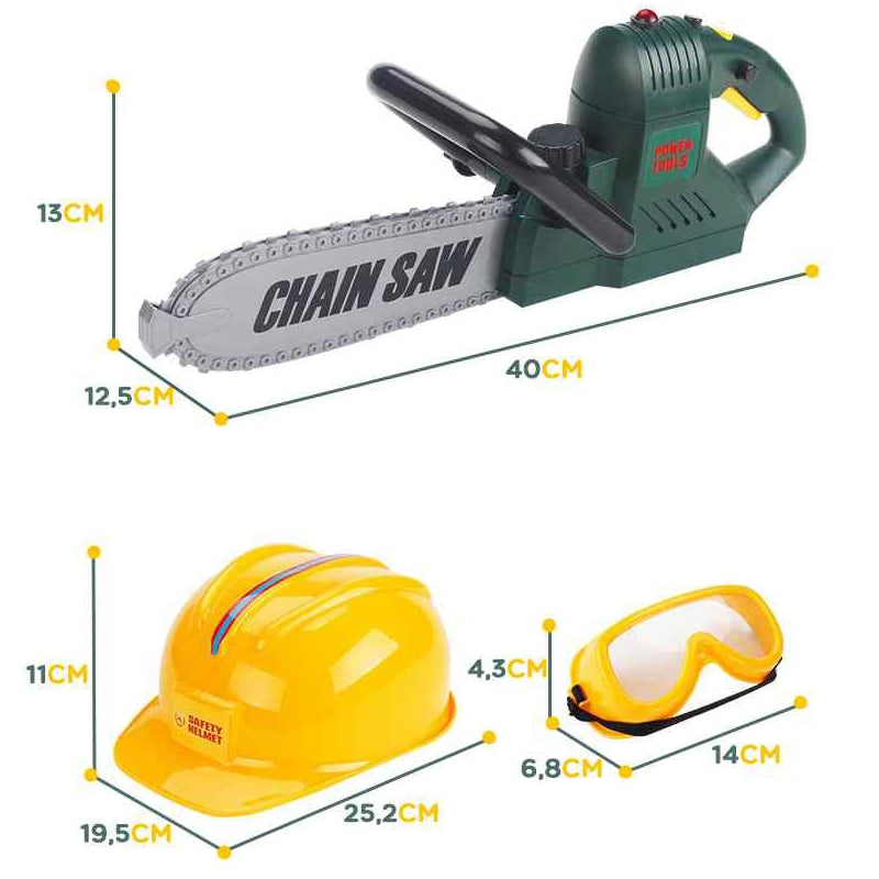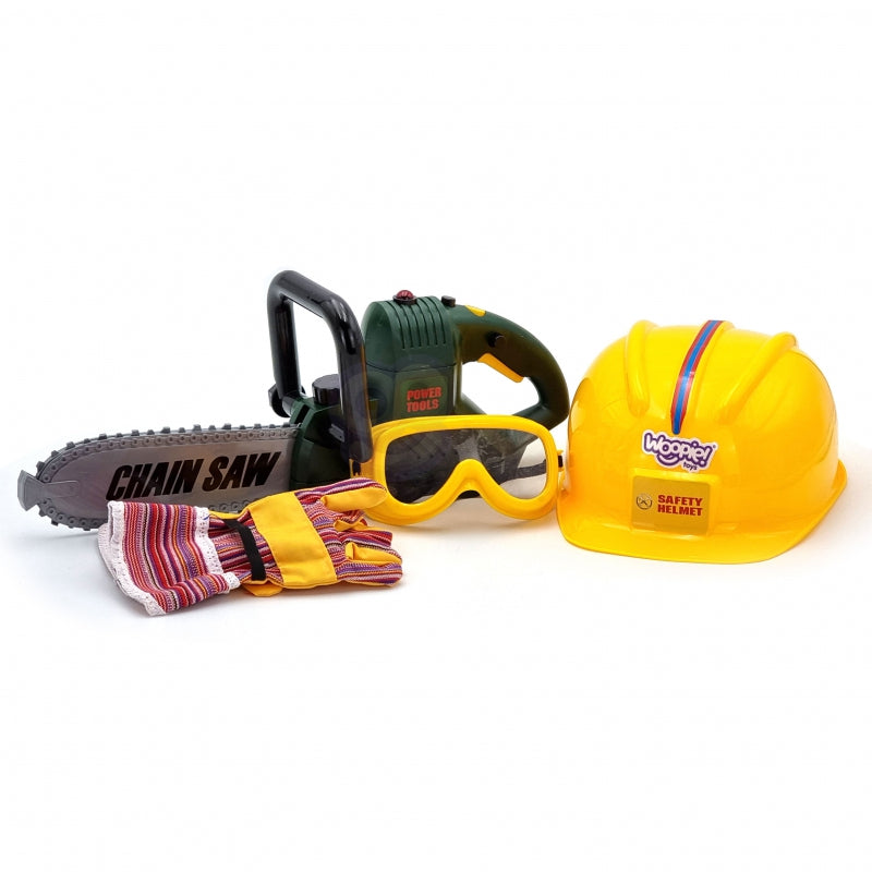 Duży zestaw Piła Kask Okulary i Rękawiczki od firmy WOOPIE, to zestaw który dzieci uwielbiają. Dzieci podpatrując swoje najbliższe otoczenie często bawią się w zabawy polegające na naśladowaniu działań dorosłych. Właśnie z tego powodu prezentujemy propozycję dla małych pomocników w postaci bezpiecznej, dziecięcej piły, kasku, okularów oraz rękawic. Aby zacząć zabawę należy wcisnąć czarny guzik na górze, a gdy czerwone światełko zamigocze 3 razy, naciśnij na guzik przy rączce, a piła zadziała jak prawdziwa i łańcuch poruszy się wzdłuż prowadnicy.