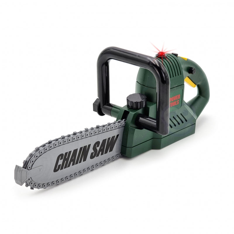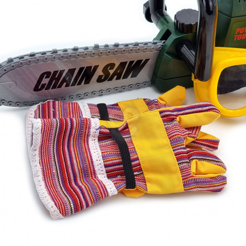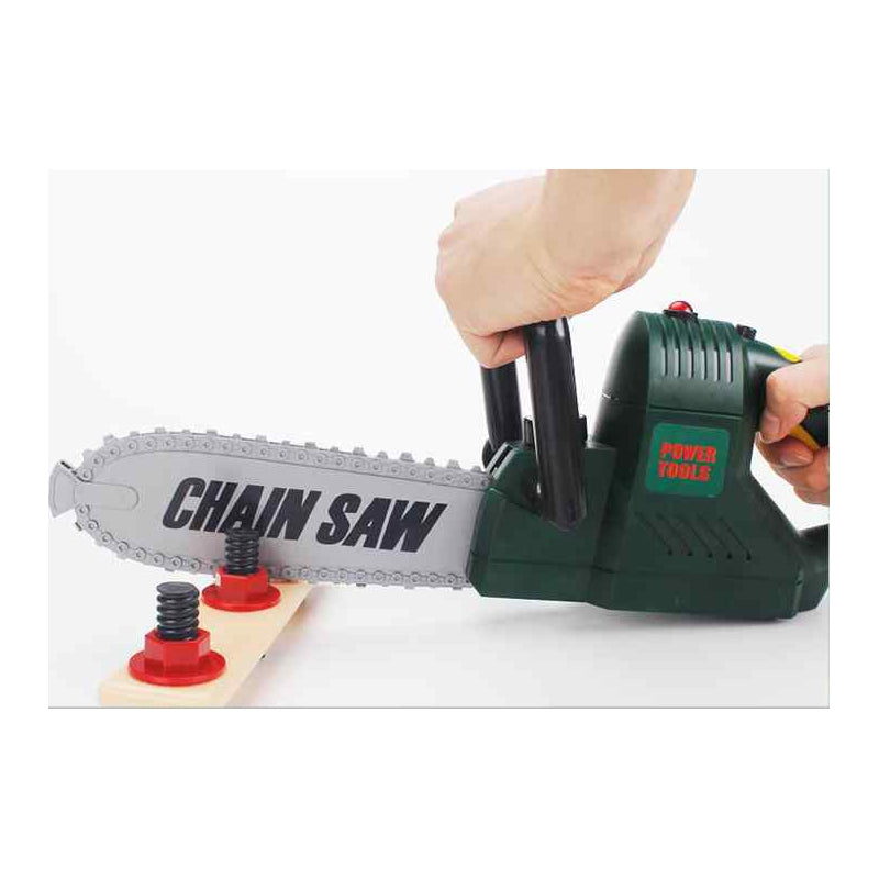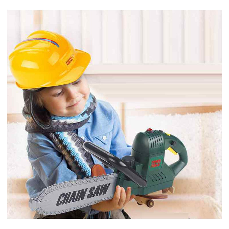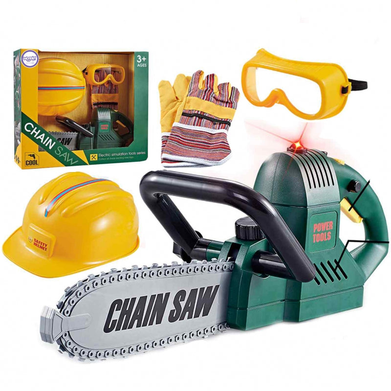 Duży zestaw Piła Kask Okulary i Rękawiczki od firmy WOOPIE, to zestaw który dzieci uwielbiają. Dzieci podpatrując swoje najbliższe otoczenie często bawią się w zabawy polegające na naśladowaniu działań dorosłych. Właśnie z tego powodu prezentujemy propozycję dla małych pomocników w postaci bezpiecznej, dziecięcej piły, kasku, okularów oraz rękawic. Aby zacząć zabawę należy wcisnąć czarny guzik na górze, a gdy czerwone światełko zamigocze 3 razy, naciśnij na guzik przy rączce, a piła zadziała jak prawdziwa i łańcuch poruszy się wzdłuż prowadnicy.
