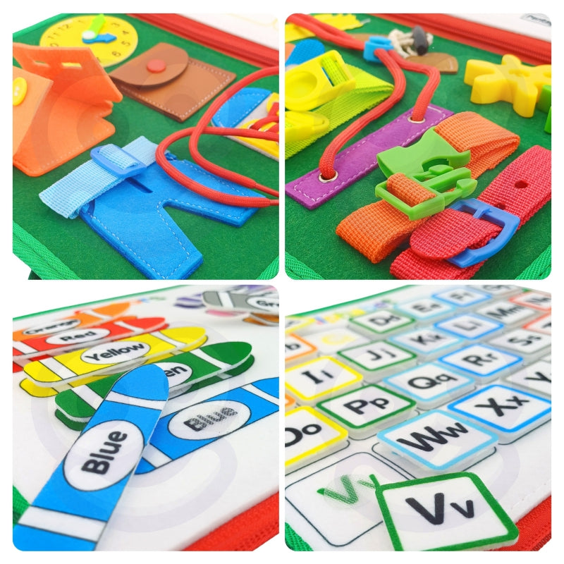 - Zdejmowane warstwy Montessori. Centralne warstwy tablicy można łatwo odpiąć dzięki zamkowi błyskawicznemu, co pozwala na indywidualną zabawę każdą z nich.