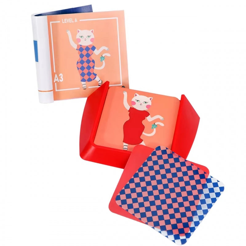 - W zestawie: stojak do gry, 4 szablony, 18 kart ze wzorami i książeczka z zadaniami