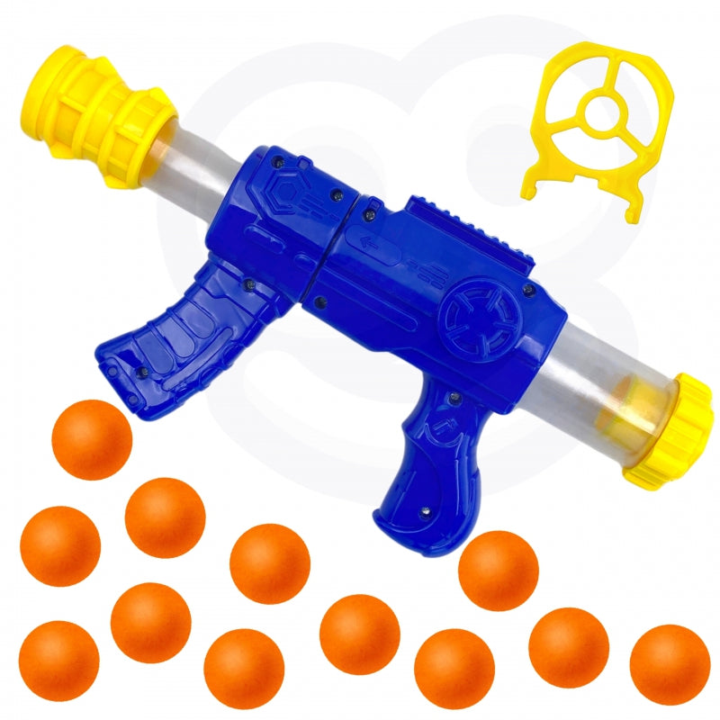 - pistolet jest zasilany powietrzem, wystarczy więc docisnąć kolbę do siebie po czym odepchnąć ją, a piłeczka wystrzeli